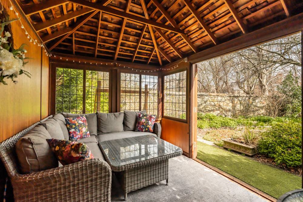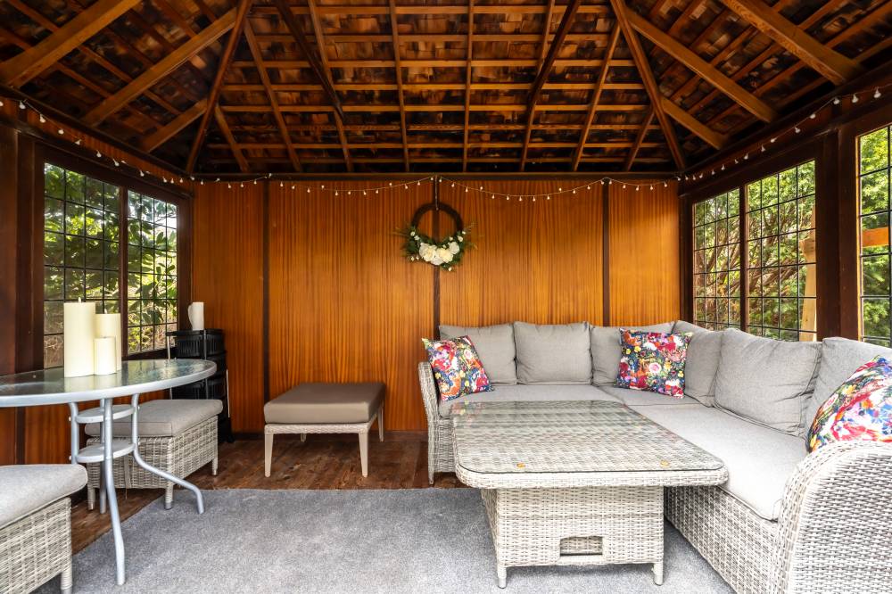 To the front of the house a gated drive is flanked by verdant well stocked beds, leading in turn to a single garage and shared parking. The flat boasts its own substantial lawned garden, bordered by hedgerow and peppered with a variety of bushes, shrubs and mature trees. The space has a wonderfully tranquil feel and features a charming summerhouse, offering an idyllic spot to relax and entertain during the warmer months.