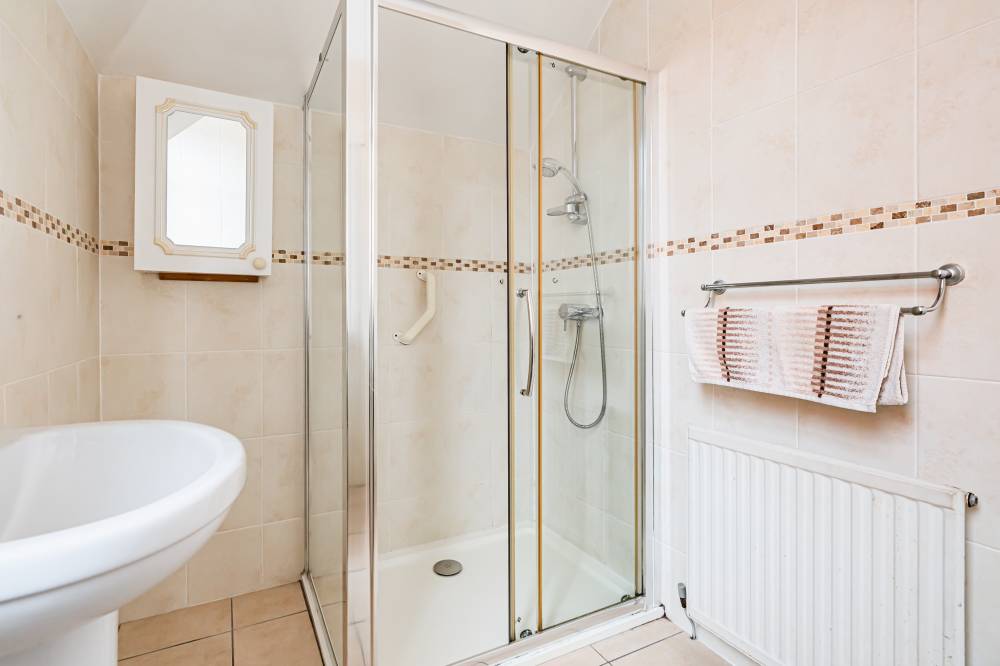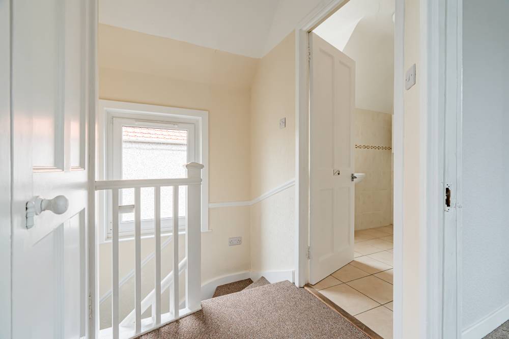 On the upper level there is a spacious principal bedroom with fitted wardrobes, two further double bedroom and a tiled shower room with two-piece suite and mains shower enclosure.