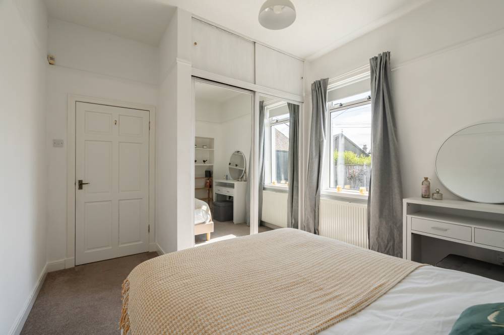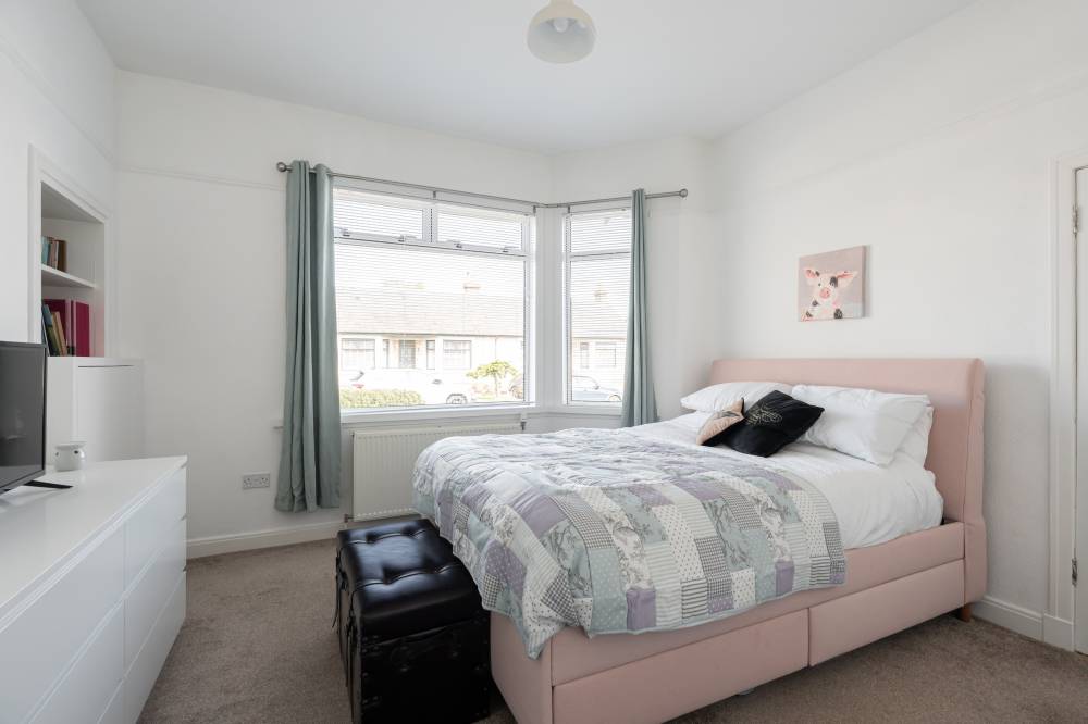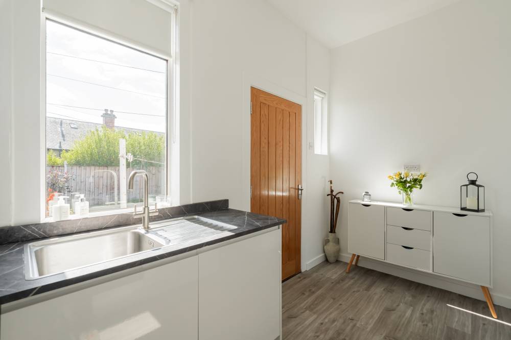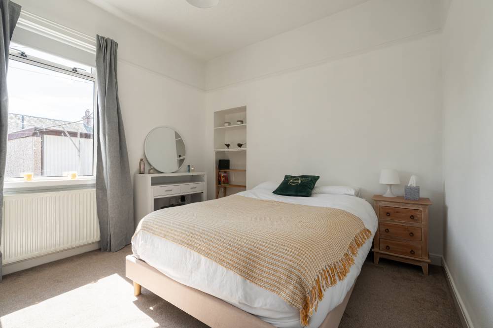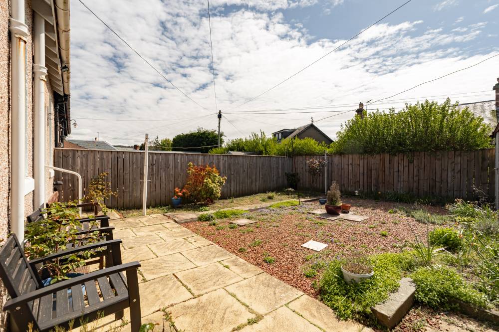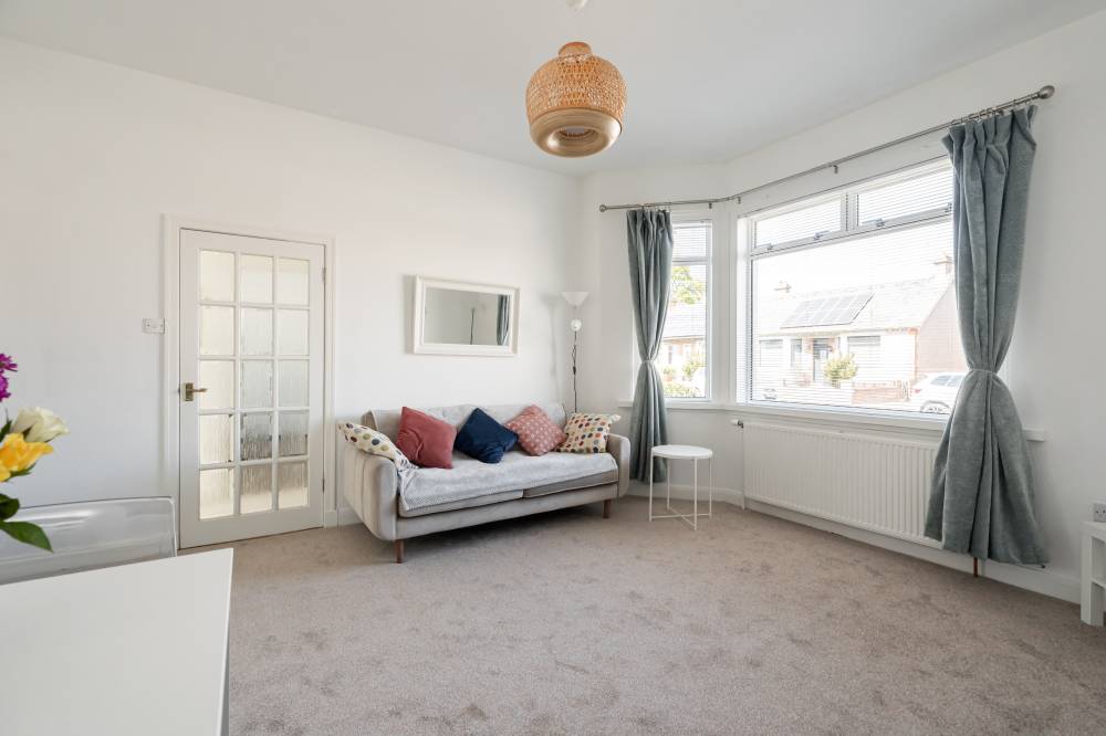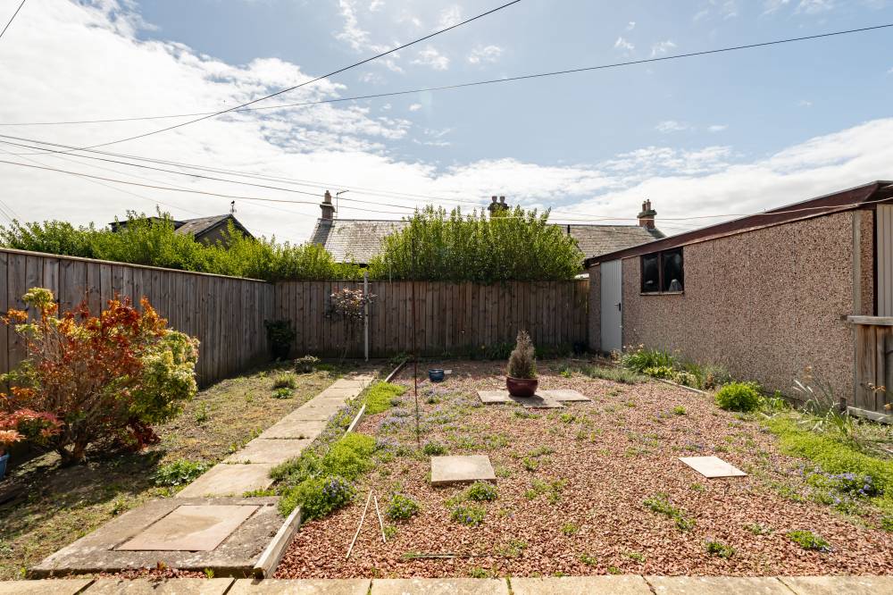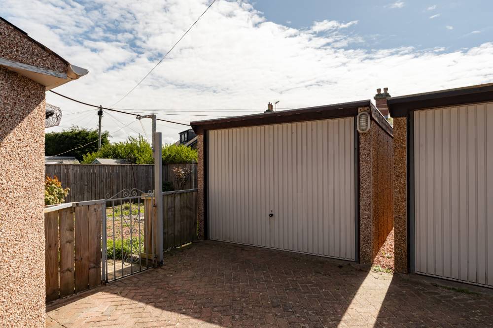 The accommodation begins with a welcoming vestibule leading into a central hallway, creating a pleasant introduction to the home. The sitting room is bright and generously sized, offering ample space for both relaxation and dining. This versatile living area is ideal for everyday use as well as entertaining guests. The modern kitchen is fitted with a range of wall and base units, providing good storage and workspace. It is equipped with an integrated oven, four-ring gas hob, and extractor hood, and benefits from direct access to the rear garden, perfect for ease of use and indoor-outdoor living. There are two spacious double bedrooms, both well-proportioned and neutrally decorated. One of the bedrooms benefits from built-in wardrobe storage, adding to the home’s practicality. The accommodation is completed by a recently upgraded family bathroom, featuring a pristine white three-piece suite, an overhead shower, and stylish coordinating tiling for a clean, contemporary finish.