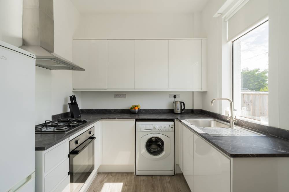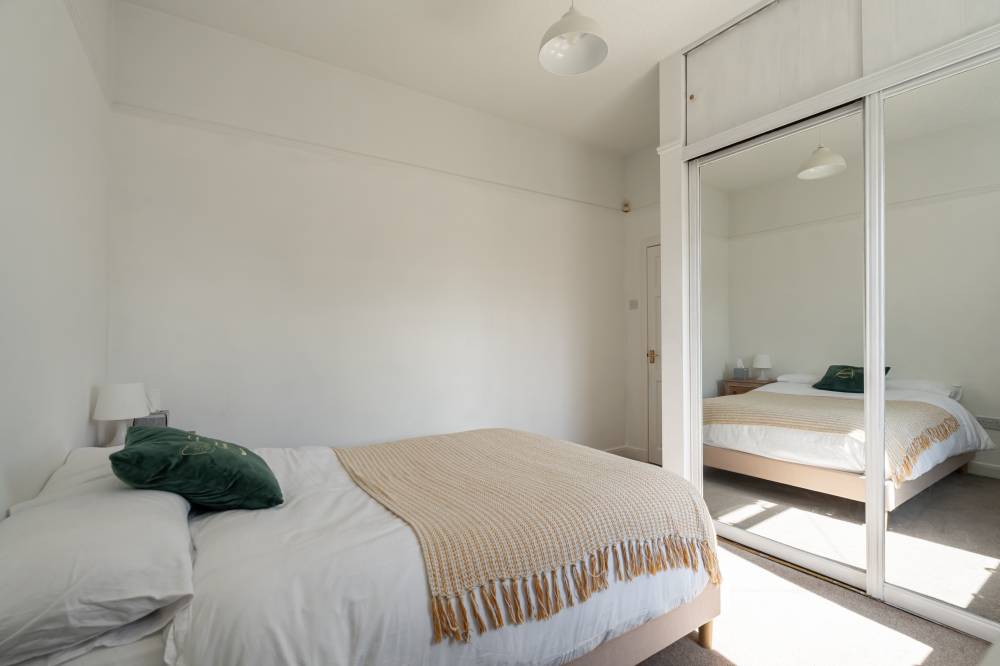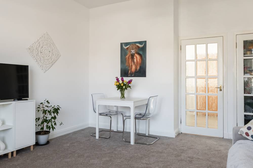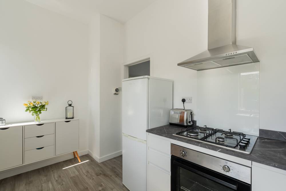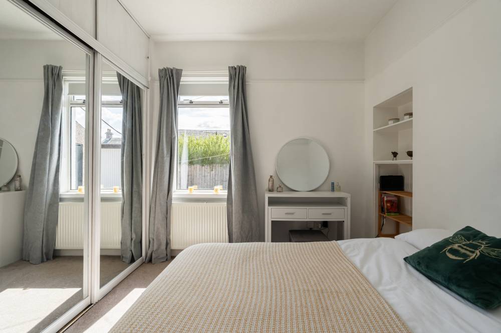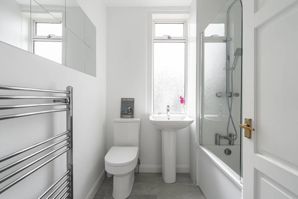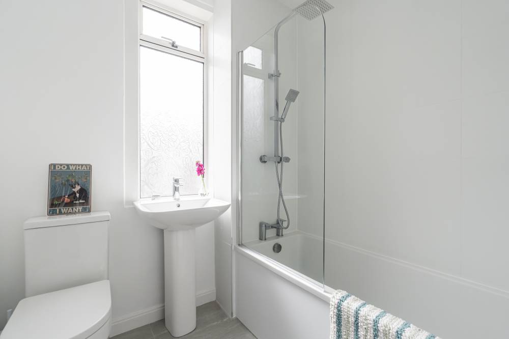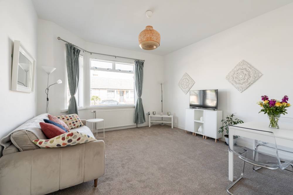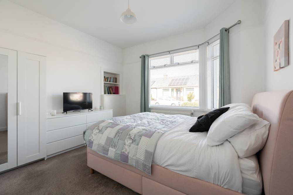 The accommodation begins with a welcoming vestibule leading into a central hallway, creating a pleasant introduction to the home. The sitting room is bright and generously sized, offering ample space for both relaxation and dining. This versatile living area is ideal for everyday use as well as entertaining guests. The modern kitchen is fitted with a range of wall and base units, providing good storage and workspace. It is equipped with an integrated oven, four-ring gas hob, and extractor hood, and benefits from direct access to the rear garden, perfect for ease of use and indoor-outdoor living. There are two spacious double bedrooms, both well-proportioned and neutrally decorated. One of the bedrooms benefits from built-in wardrobe storage, adding to the home’s practicality. The accommodation is completed by a recently upgraded family bathroom, featuring a pristine white three-piece suite, an overhead shower, and stylish coordinating tiling for a clean, contemporary finish.