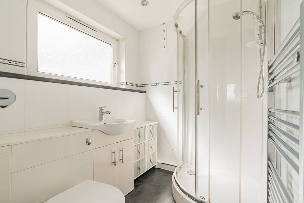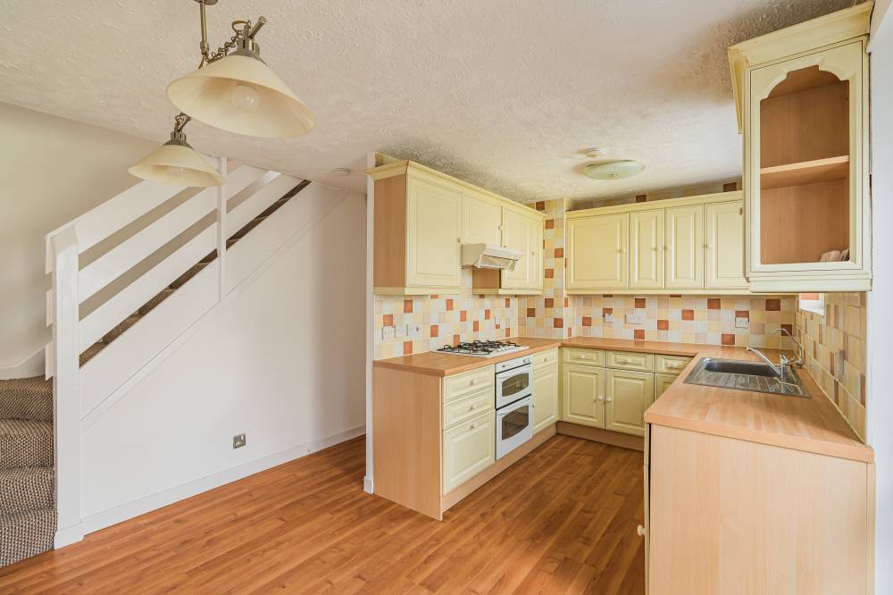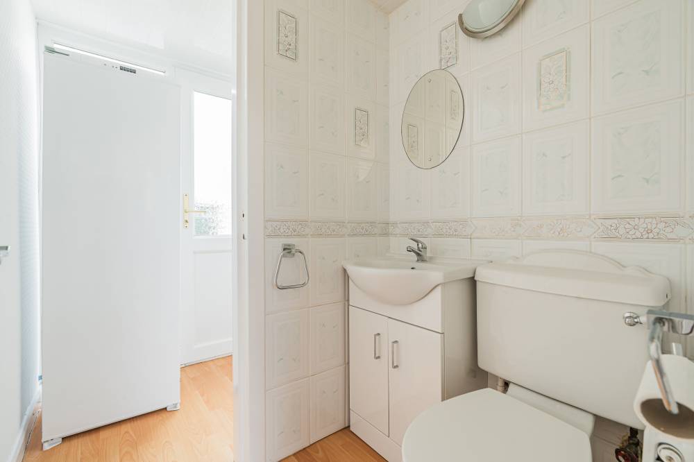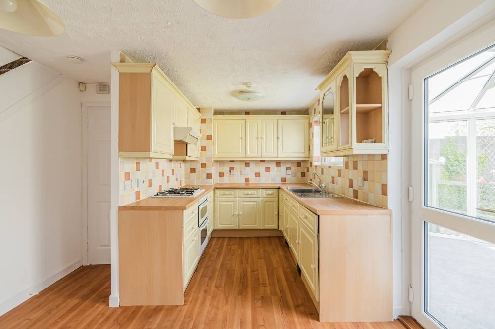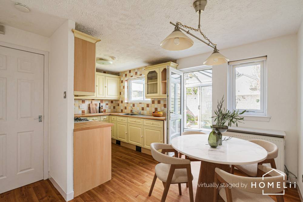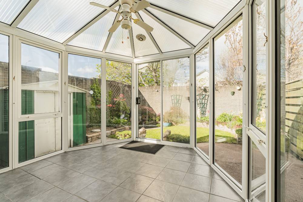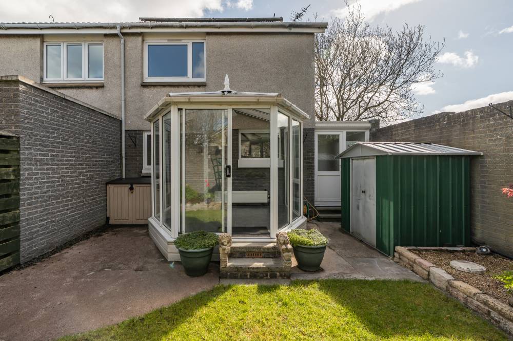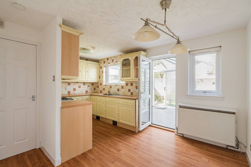 The accommodation begins with a front porch which leads into an inner hallway, providing access to the main living areas. To the front, the reception room is a bright and comfortable space, enhanced by a large picture window overlooking a communal courtyard. This room also benefits from useful shelved storage with integrated lighting, adding to its practicality. To the rear, the dining kitchen is well arranged with a range of fitted wall and base units, along with integrated appliances including a hob, oven, and extractor hood. There is ample space for dining, making it a sociable hub of the home, and this area flows naturally into a conservatory. The conservatory provides an additional reception space and enjoys a direct connection to the rear garden. The property offers three double bedrooms, each providing comfortable and flexible accommodation. The rear-facing bedroom enjoys a quieter position, while the two additional bedrooms benefit from open aspects and incorporate useful storage solutions. The bathroom is fully tiled and fitted with a two-piece suite set within vanity storage, alongside a corner shower enclosure with an electric shower and a chrome towel rail.