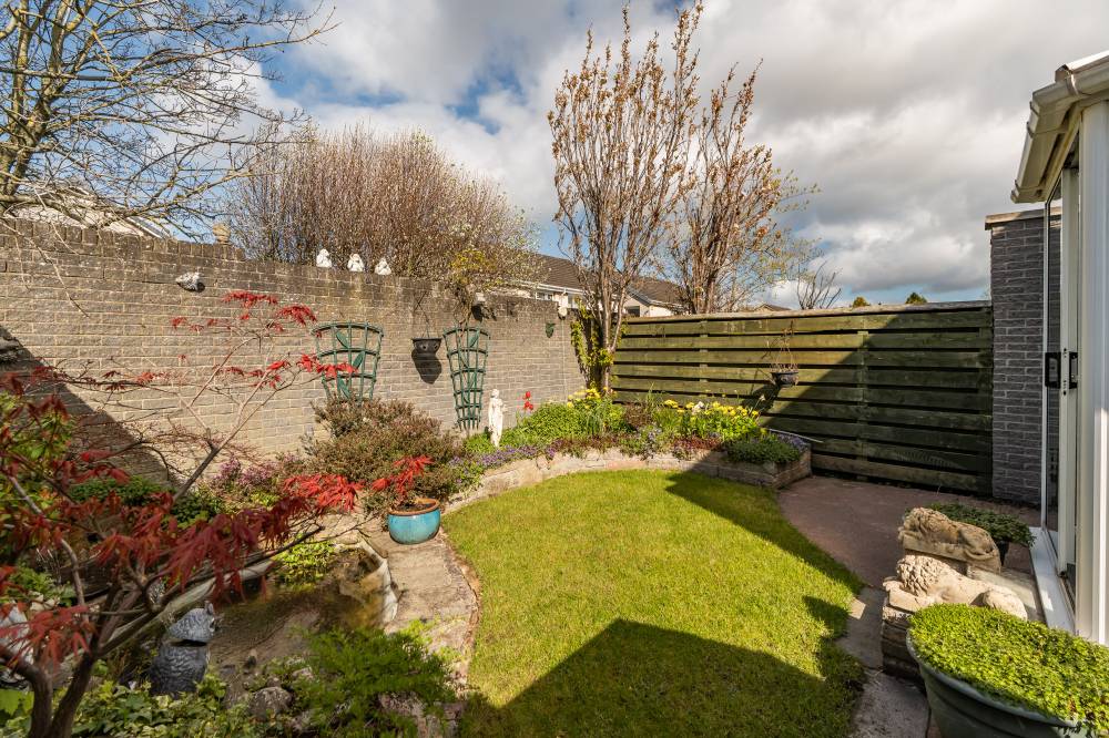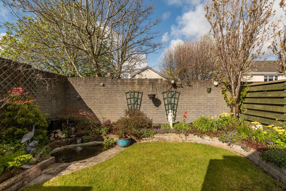Externally, the enclosed rear garden offers a variety of outdoor features, including a patio area, lawn, pond, and planted borders, along with external storage. A separate lock-up garage provides further storage or parking options.