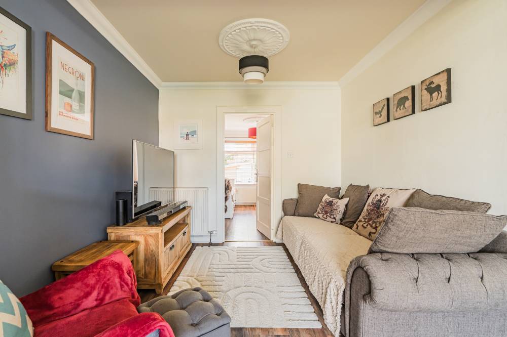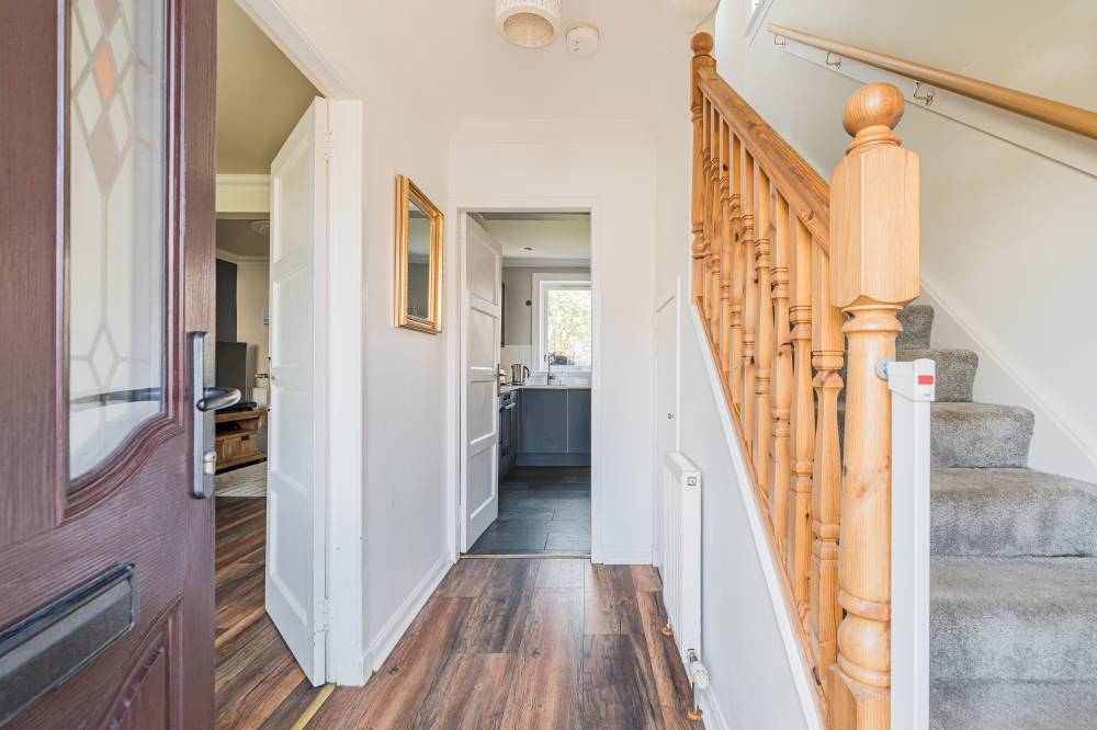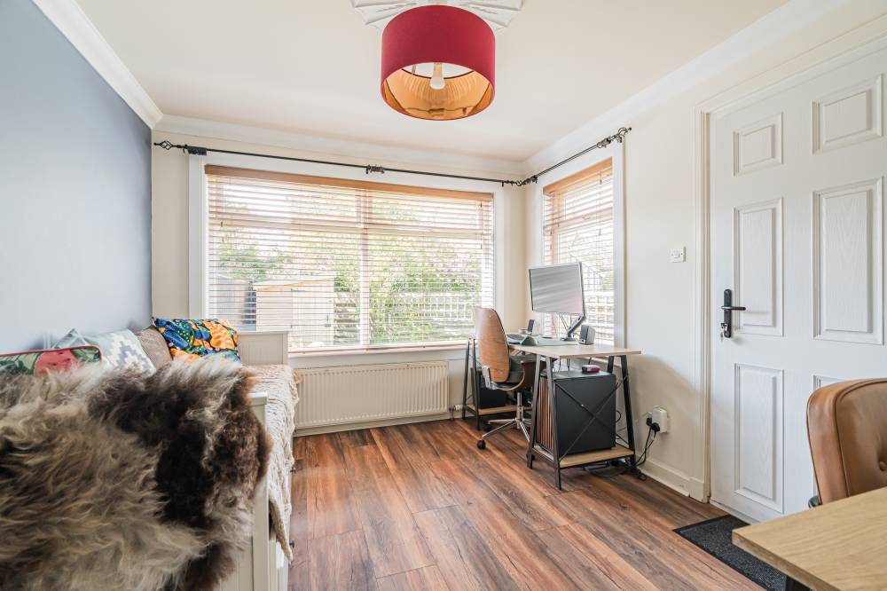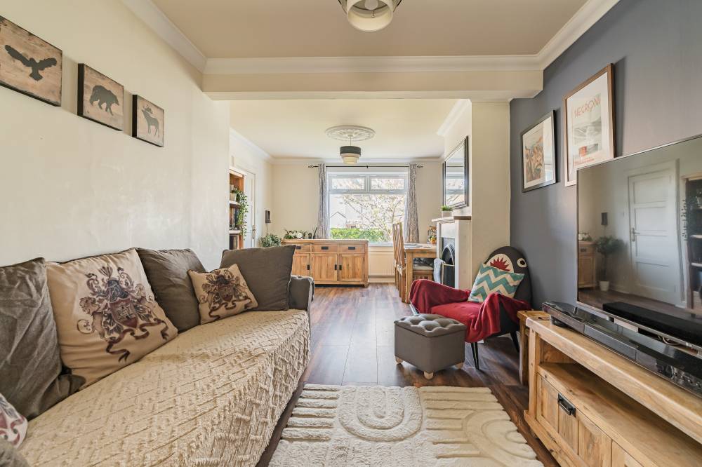 The accommodation opens with a welcoming entrance hallway, featuring a useful understairs cupboard for storage. The lounge/diner is a light and airy space with a pleasant front-facing outlook, enhanced by a decorative fireplace which creates an attractive focal point. The modern kitchen is fitted with a range of integrated white goods, complemented by partial tiling in splash areas and finished with stylish dark matte units. A key feature of the home is the ground floor extension, providing a versatile additional room which can be used as a third double bedroom or an extra living space, depending on individual needs.