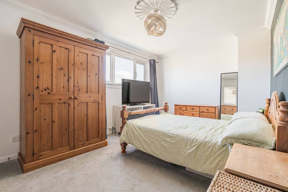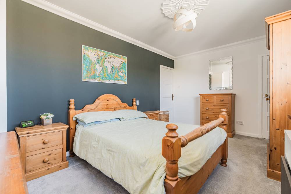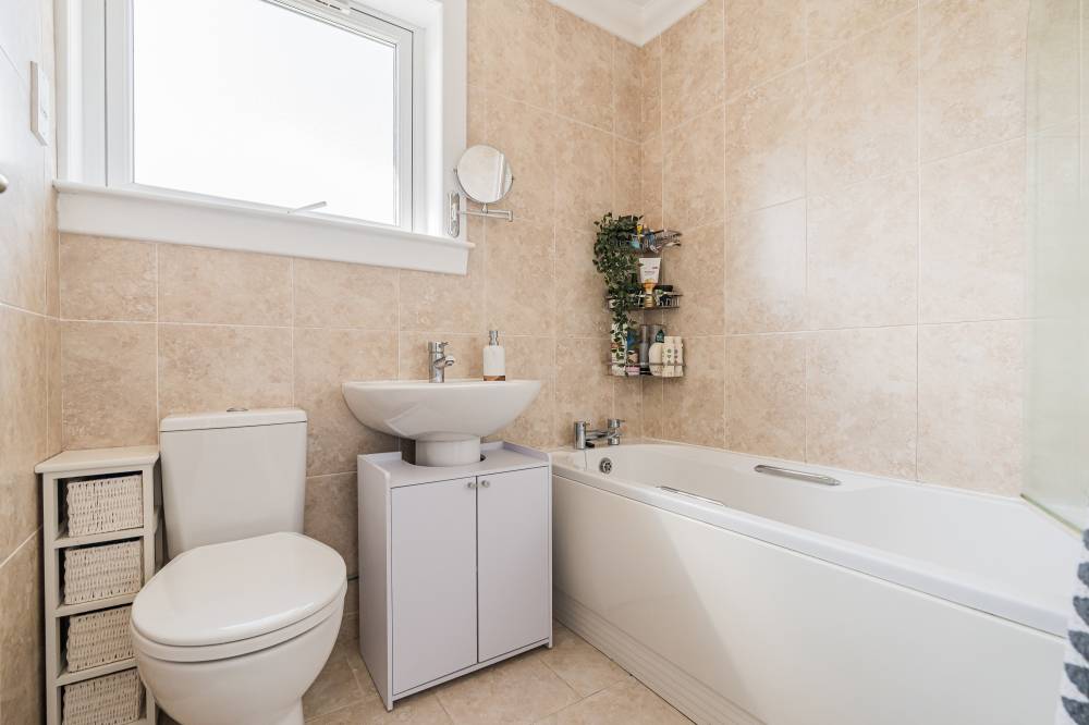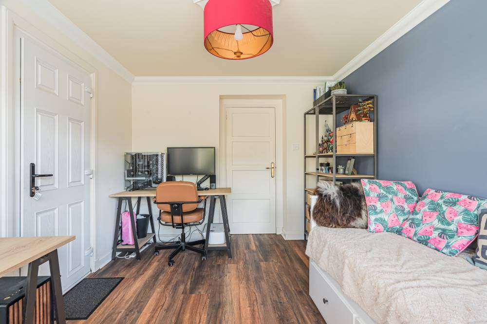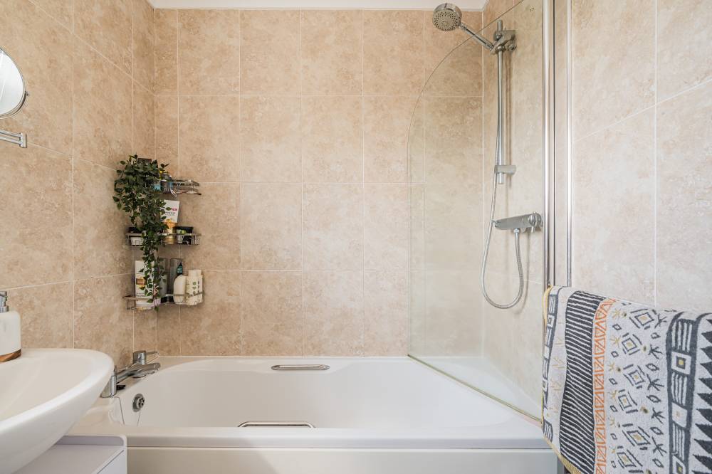 Upstairs, the landing provides access to a partially floored attic via a Ramsay ladder. There are two well-proportioned double bedrooms – bedroom one enjoys a large front-facing aspect and includes a cupboard housing the boiler, while bedroom two benefits from a rear aspect. Both rooms offer ample space for freestanding furniture and flexible layouts. The bathroom is fully tiled, featuring tiled flooring, a shower over bath, and a heated towel rail.